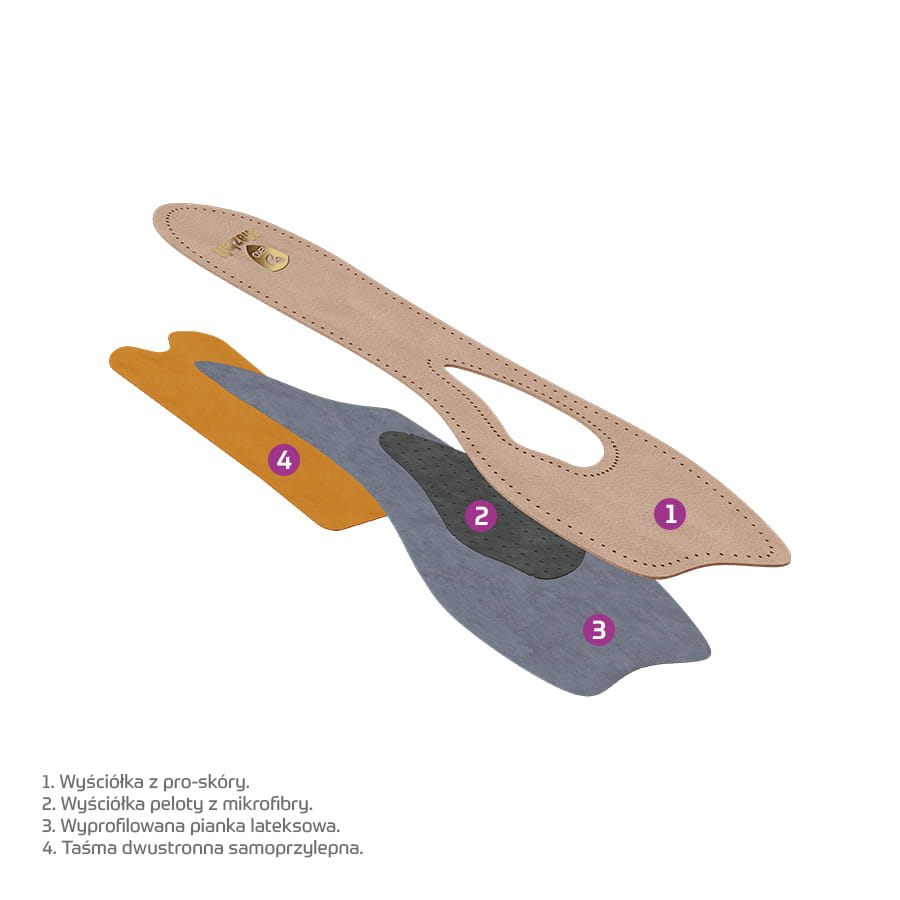 Wkładki ortopedyczne Twist 3/4 posiadają pelotę w kształcie fasolki wspierającej II i III głowę kości śródstopia, co wspiera terapię płaskostopia poprzecznego i odciąża przodostopie. Na całej długości zastosowana została miękka pianka lateksowa zapewniająca odczucie komfortu. Wkładki posiadają wyściółkę z pro-skóry, która zapewnia dobre odprowadzenie potu i jest bezpieczna dla wrażliwej skóry