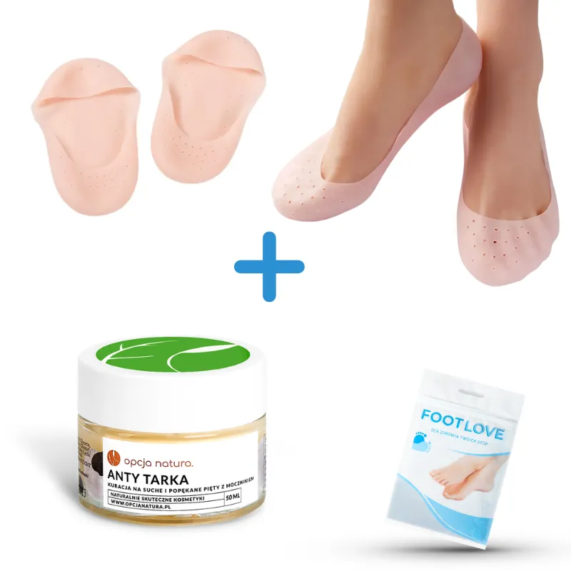 - Silikonowe stopki nawilżające N18L (para): Miękkie, żelowe baleriny w rozmiarze 39-43, które potęgują wchłanianie kremu, chroniąc jednocześnie skórę przed utratą wody i otarciami.